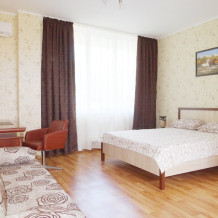 Все апартаменты оборудованы санузлом, совмещенным с душевой кабиной и имеет фен для волос, современный ЖК телевизор с ТВ каналами, кондиционер, холодильник, чайник с посудой, бесплатный Wi-Fi, шкаф купе с большим зеркалом и прикроватными тумбами, журнальным столиком, кроватями для размещения гостей согласно категории.
