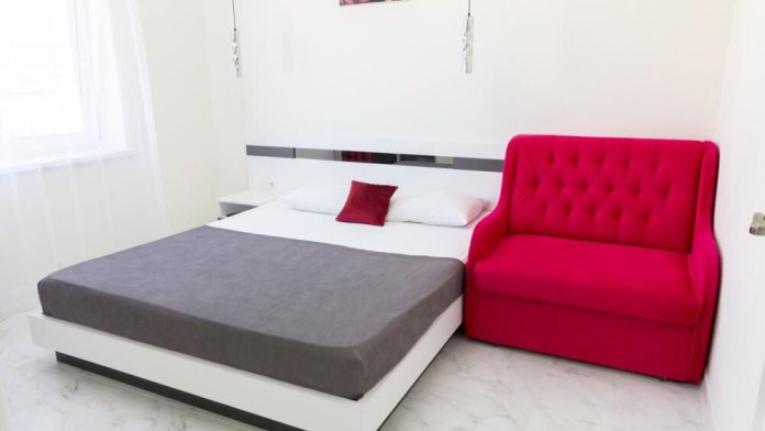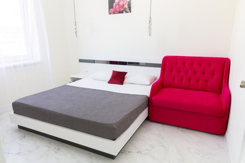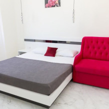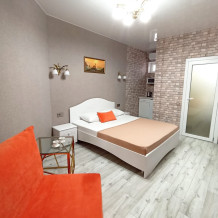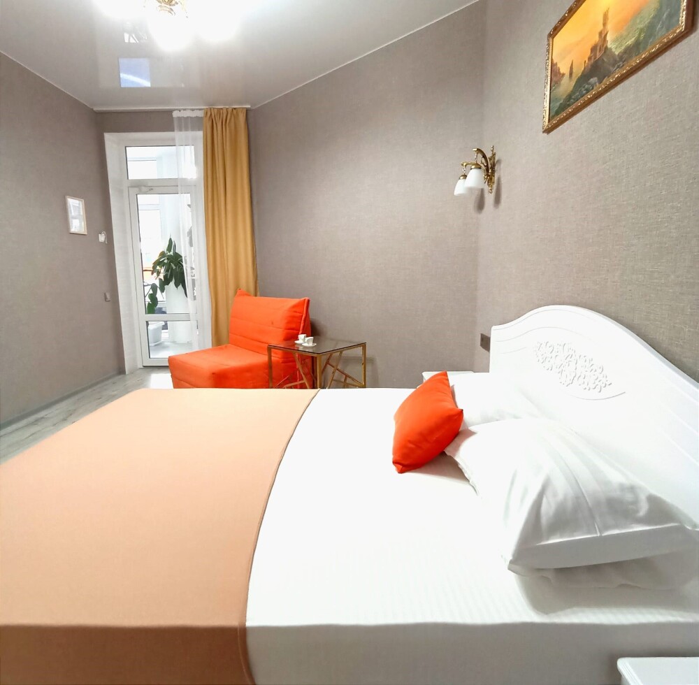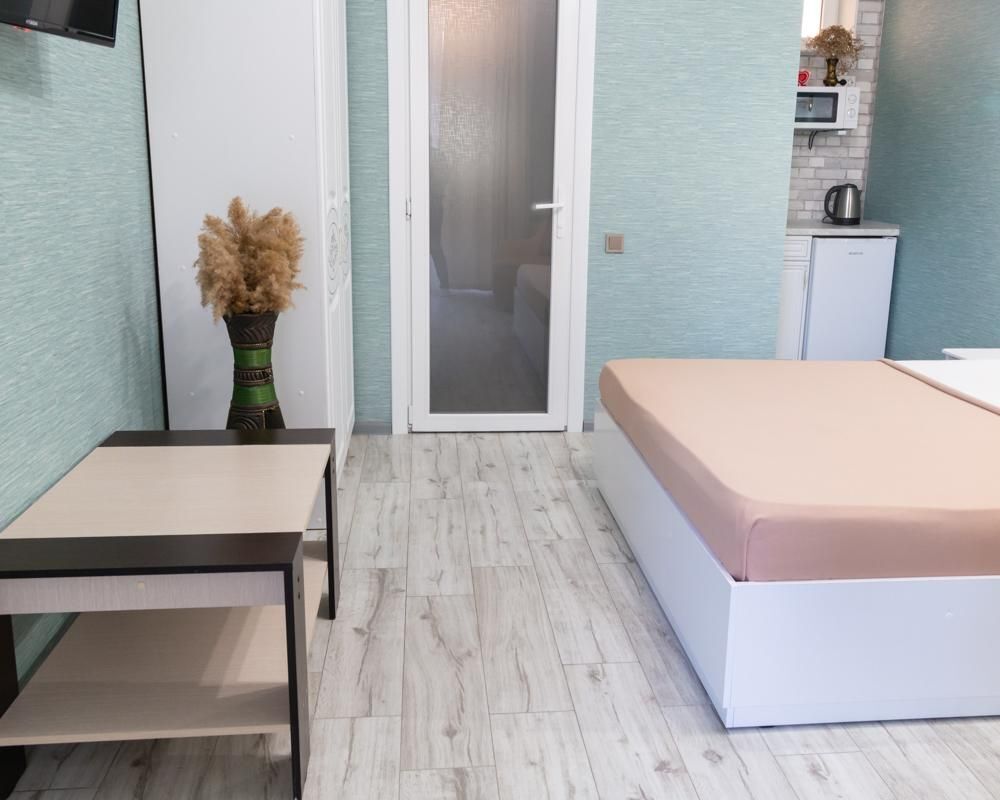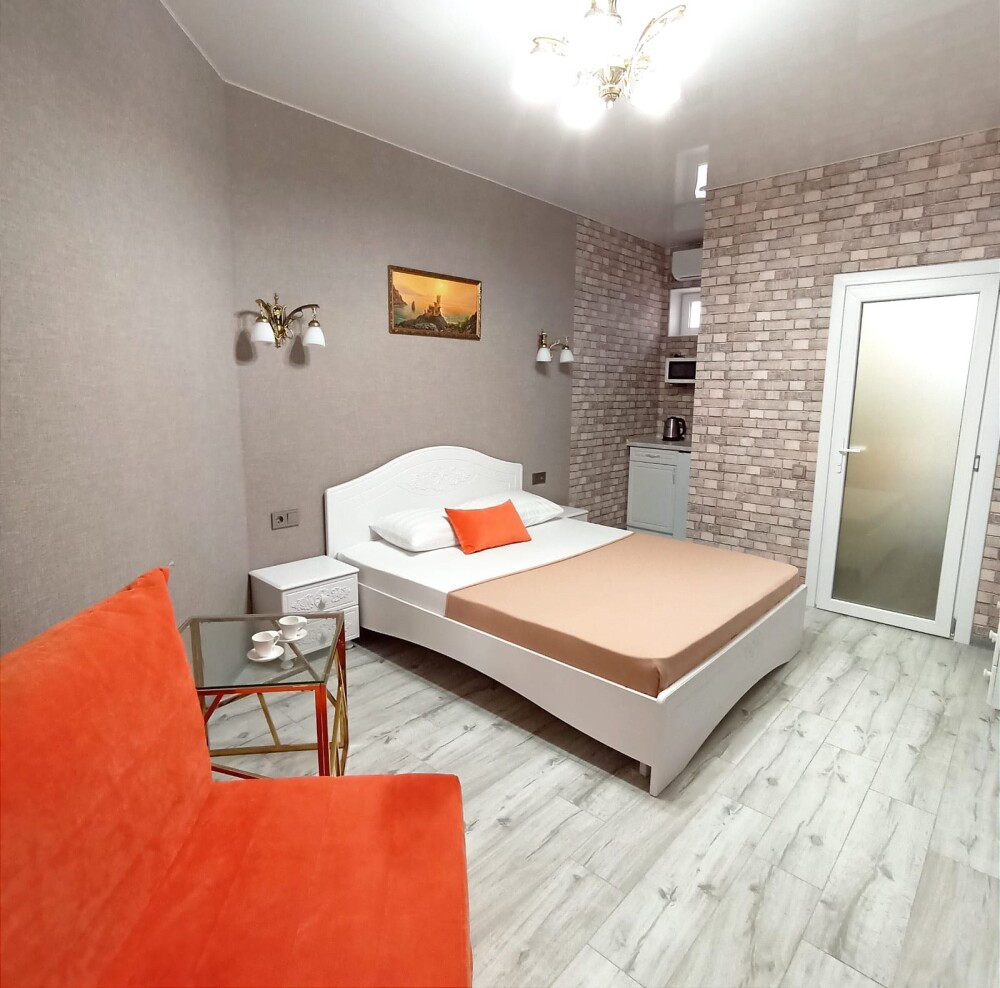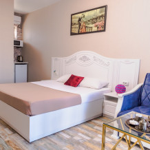 В номере спальня и комната- студия. Кухня с плитой и посудой в номере, холодильник, вытяжка. Стол со стульями.