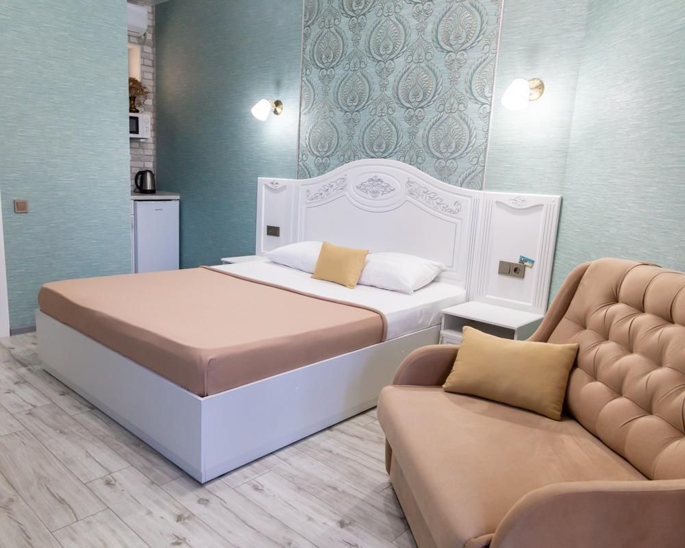 В однокомнатном номере есть мини кухня-микроволновая печь, эл. чайник, холодильник, посуда. Также: полотенца, тапочки, фен, мыло, гель для душа. Балкон общий со столиками и креслами. Бельё меняется по по требованию.