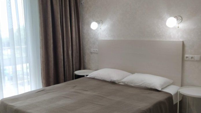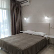 1) отдельные 1-комнатные апартаменты класса «комфорт» на 2-4 чел. (спальня 14 кв.м, кухня 6 кв.м, санузел с душем, кондиционер) с двуспальной и диван-кроватью;