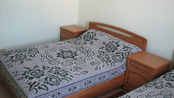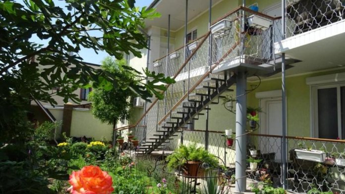 Для отдыха предлагается современный двухэтажный дом, с террасы которого Вы можете любоваться зеленым цветущим садом, уютно разместившись в креслах из ротанга. На первом этаже расположены гостевой 2-комнатный 4-местный семейный номер, общая кухня с электроплитой, с духовкой, большим двухкамерным холодильником, микроволновкой, стиральной машиной. На кухне имеется вся необходимая посуда для приготовления пищи, а также столовые, чайные, кофейные сервизы и все необходимое для комфортного приема пищи. Двери гостевого номера и кухни выходят на террасу, на которой также расположены ротанговые кресла и небольшой столик для отдыха и чаепития, гладильная доска с утюгом, сушилка для белья. По пологой лестнице от входа в коттедж можно подняться на террасу второго этажа, на которую выходят двери четырех гостевых номеров – двух 2-местных, 3-местного и 1-местного с диван-кроватью. На террасе второго этажа также имеются сушилки для белья и диванчик из ротанга.