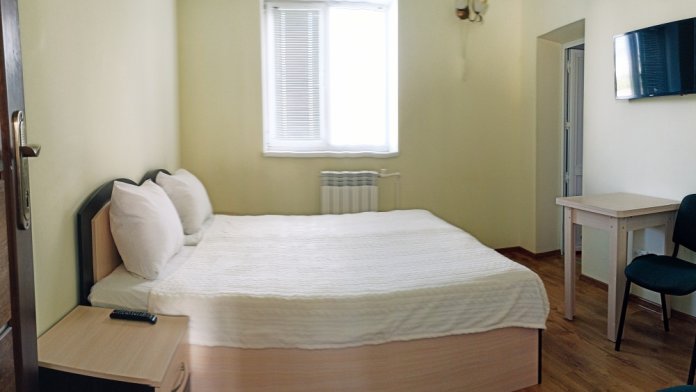 Двухместный номер расположен на первом этаже гостевого дома. В комнате кровать, комод, стол, стулья, тумбочки, телевизор, кондиционер, Wi-Fi. Также постельное белье, полотенца, покрывала. Санузел в номере. Вид из окна на задний двор.