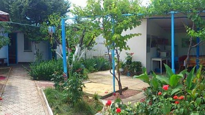 Во дворе в отдельно отведенном месте расположены 4 летних душа, отделанные кафелем, с подогреваемой через гелиобатареи водой, 2 раковины (мойки), канализация из комнат и душевых кабин централизованная. На территории растут фруктовые деревья, виноградник, всевозможные цветы. Большая часть двора покрыта плиткой. Для культурного отдыха днем и вечером имеются 4 специальных места под зонтами и покрытием, где установлены столы и места для сидения. Кроме этого, во дворе располагается специальный крытый кухонный блок со столами, скамейками, холодильником, большим телевизором, электро и газовой плитой, микроволновкой, мультиварка, чайником – термосом и всевозможной посудой. Здесь отдыхающие всегда могут приготовить себе обед. Для любителей шашлыков есть мангал, шампура и решетка для барбекю.