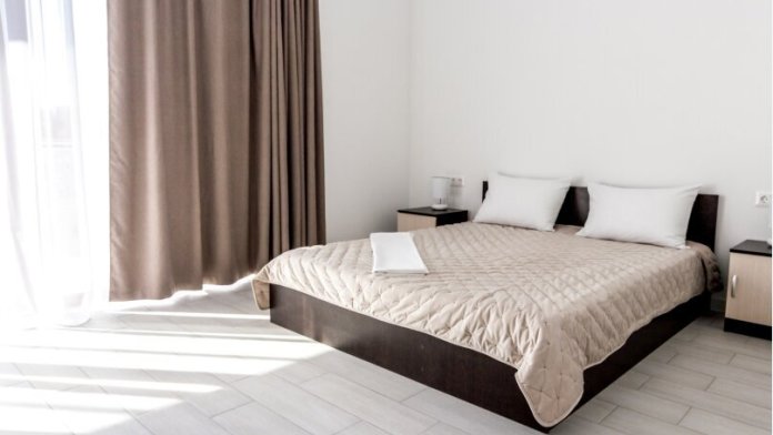 Светлый номер, панорамные окна в пол. Отдельный вход на гостевой этаж. Новая мебель и сантехника. Имеет выход на большую открытую террасу с видом на горы Демерджи и Чатыр-Даг. В номере: двуспальная кровать с прикроватными тумбами и бра, cобственный санузел с просторным душевым уголком (тропический душ, ручной душ), собственная терраса со столиком и креслами, шкаф и комод для одежды и личных вещей, Smart-TV LED, бесплатный высокоскоростной Wi-Fi интернет, кондиционер, теплый пол.